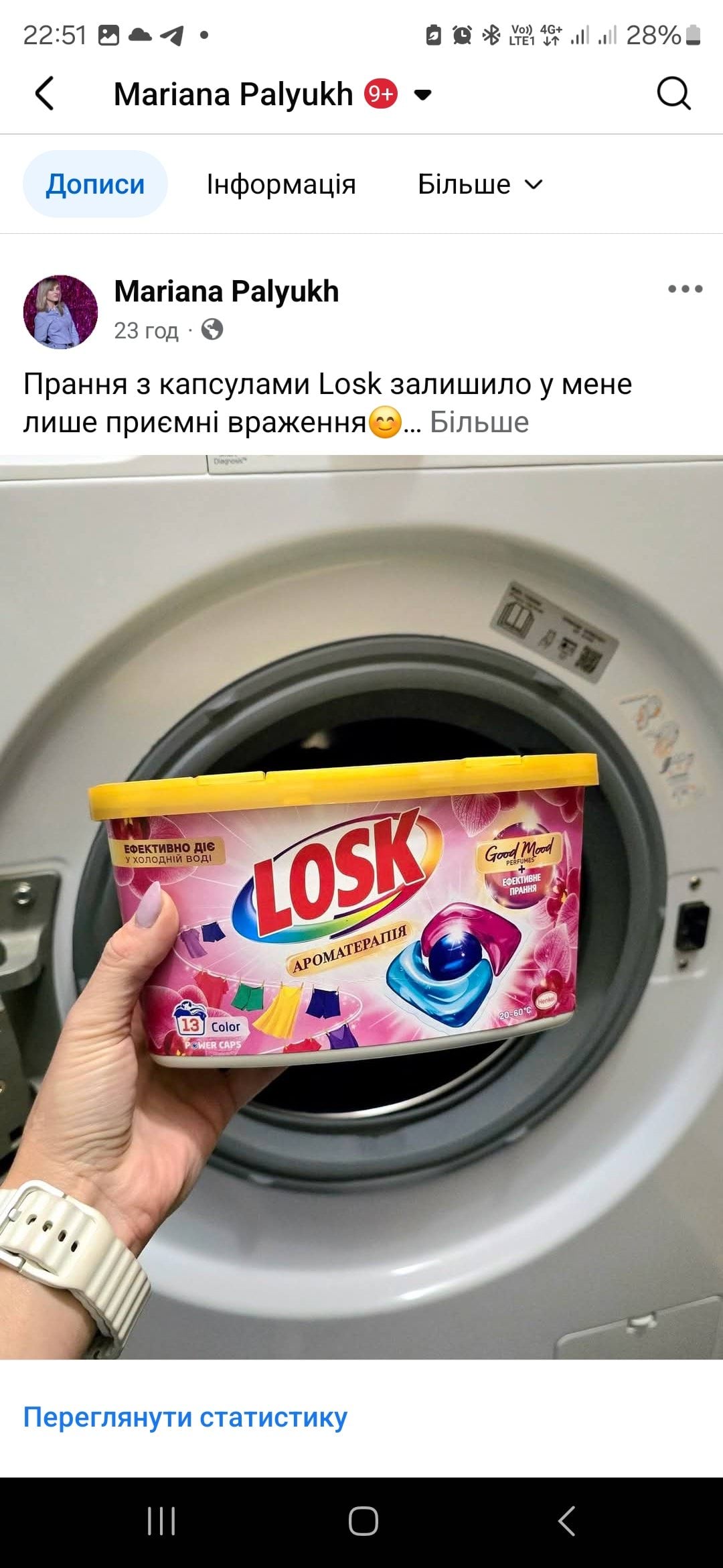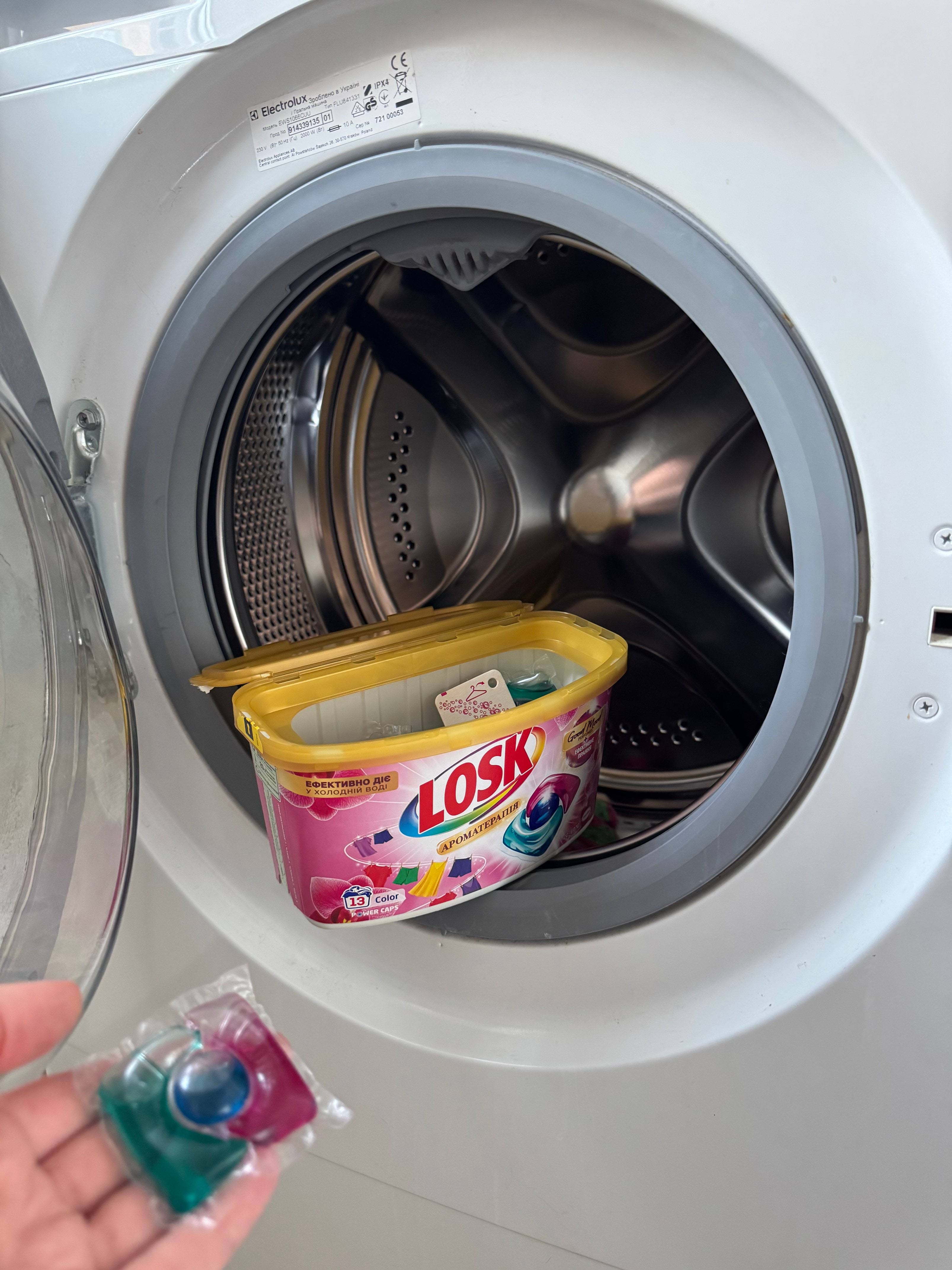 Положите одну капсулу Losk Power-Caps непосредственно в барабан стиральной машины, в ее заднюю часть. Сверху загрузите грязное белье. Не прикасайтесь к капсуле мокрыми руками. Капсулу не нужно разрезать или прокалывать. Используйте одну капсулу на цикл стирки для средней загрузки.