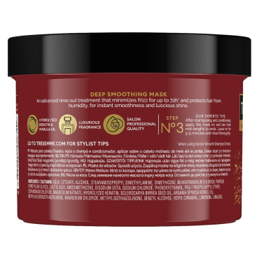 Разглаживающая маска Tresemme Keratin Smooth (440 мл) с кератином и маслом марулы. Обеспечивает контроль пушистости до 72 часов, придает волосам зеркальный блеск, мягкость и гладкость.