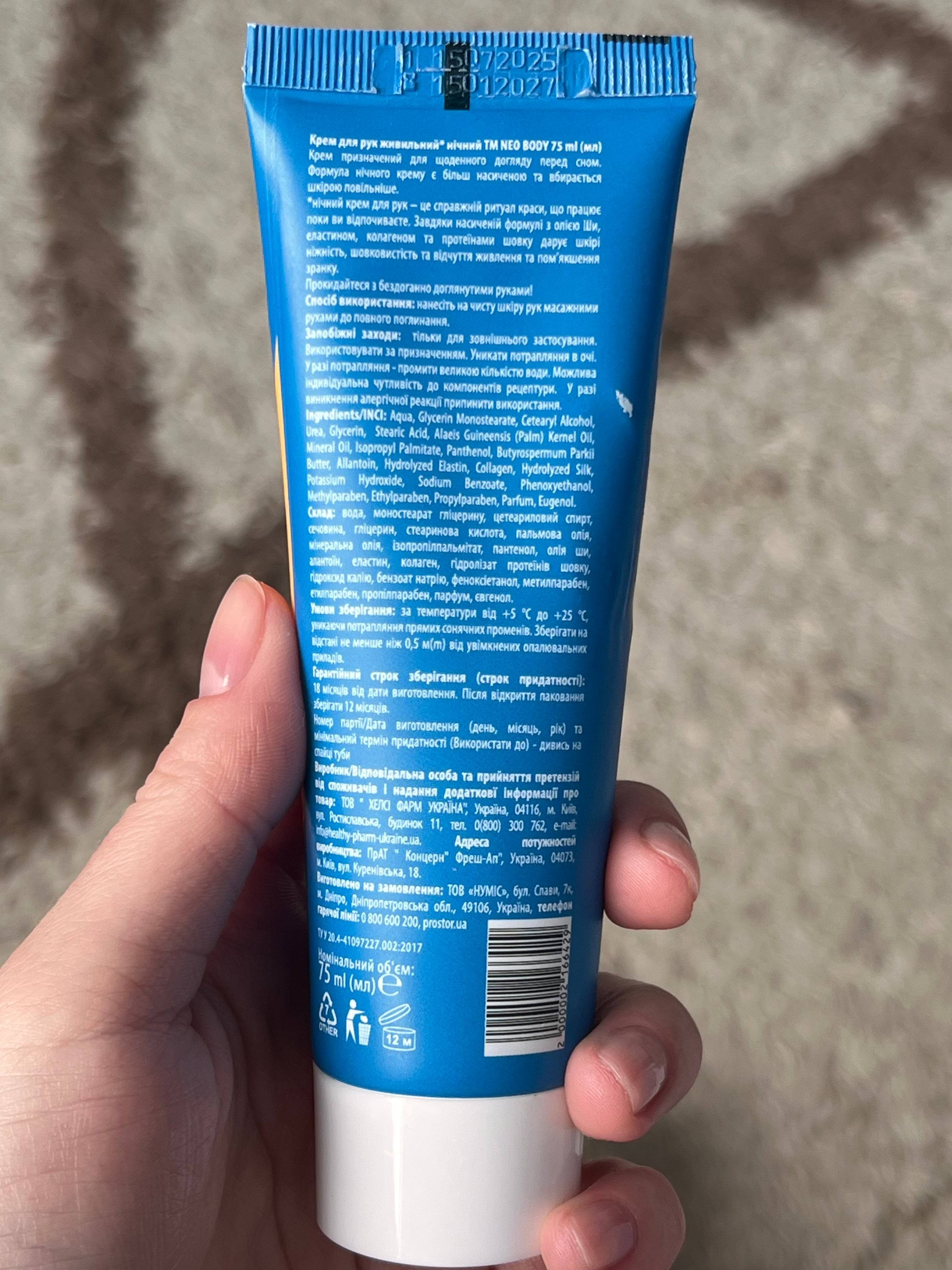 Питательный ночной крем для рук NEO BODY разработан для глубокого восстановления кожи во время сна. Формула с натуральными маслами и активными компонентами интенсивно питает, смягчает и защищает кожу, способствуя её обновлению и регенерации в ночной период. Благодаря плотной, но быстро впитывающейся текстуре, крем не оставляет ощущения липкости и дискомфорта. Упаковка объёмом 75 мл удобна для домашнего ухода и путешествий.