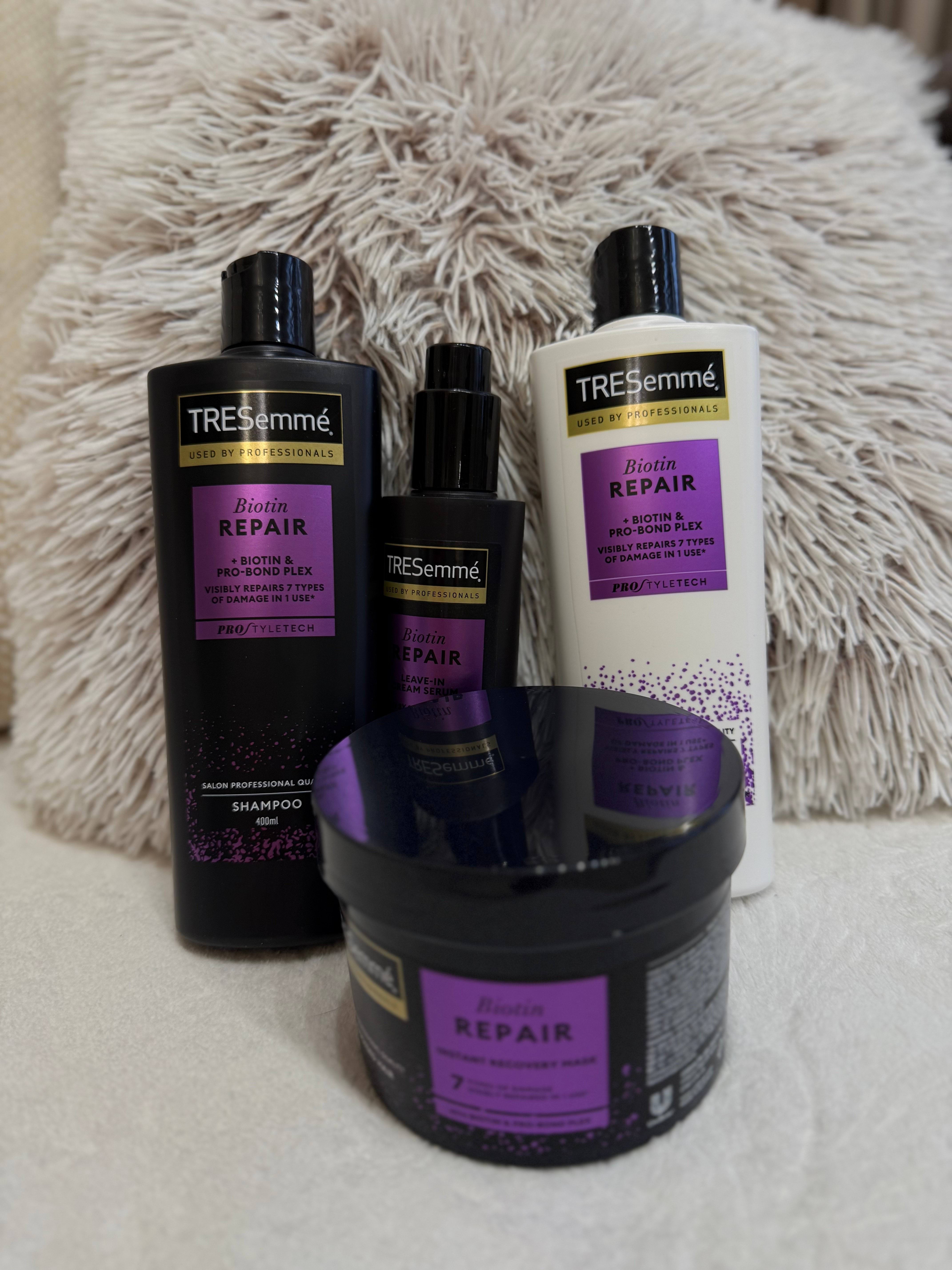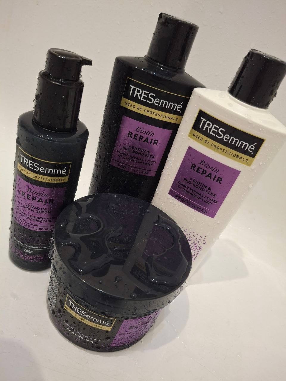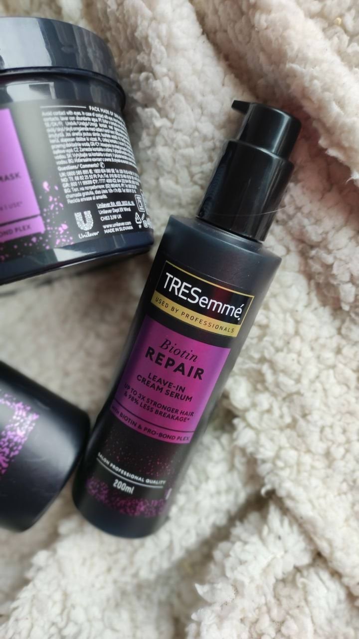 Крем-сироватка Tresemme Biotin Repair використовує унікальну формулу, де біотин зміцнює структуру волосся, а технологія Pro-Bond Plex допомагає відновлювати та створювати нові зв'язки у пошкоджених волокнах, зменшуючи ламкість. Засіб має легку, кремову текстуру, яка швидко вбирається. Воно розгладжує кутикулу, створюючи захисний шар, який запобігає втраті вологи та захищає від термічного впливу при укладанні.